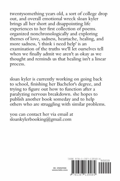 Emotional breakdowns are never easy. With only one semester standing between her and her diploma, Sloan Kyler lost almost everything-her friends, her health, her home, her future, her family, her mind, and her will to live. After bouncing from one mandatory hospital stay to another, searching for the right doctor to listen and the right medicine to keep her lucid, she did the only thing she still could: writing. This collection of poems (purposely ordered non-chronologically) detail a struggle to cope with mental illness, loss, and loneliness, and ultimately how to move forward and begin to heal-and reminds us all that healing isn't always a linear process.