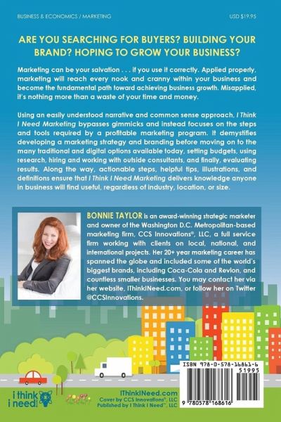 Are you searching for new buyers? Building a brand? Growing a business? It's time for I Think I Need Marketing. A comprehensive resource anyone in business will find useful, regardless of industry, location, or size, I Think I Need Marketing pulls the curtain back on one of the business world's most confusing yet necessary components: marketing. Author Bonnie Taylor's easily understood narrative and common sense approach foregoes budget-wasting gimmicks and instead focuses on the steps and tools needed to build a successful-and profitable-marketing program. By breaking marketing into easily grasped nuts and bolts supported by full color illustrations and real-world examples, I Think I Need Marketing leads readers through the process of creating a custom program destined for business growth. Enhanced with helpful tips and definitions, I Think I Need Marketing demystifies marketing with an accessible narrative about: · Creating an actionable marketing strategy that achieves business goals · Developing a winning brand and branding throughout a business · Choosing the right mix from traditional and digital marketing options · Setting budgets and saving money in marketing · Using research effectively and efficiently · Hiring and successfully working with outside consultants · Evaluating and capitalizing on results