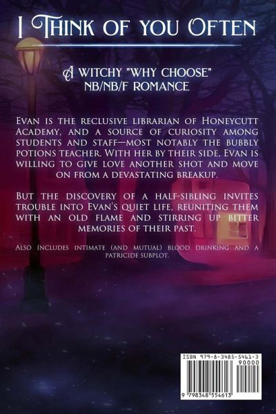 For Evangeline "Evan" Miles, Honeycutt Academy is more than just a prestigious school of magic. It's home. Before graduating, it was the first place they'd ever felt comfortable enough to be themself. Now, as a school librarian, it's also where Evan might have finally found the promise of love - with Mimi, the bright and bubbly potions professor. But when Evan meets Hester, the half-sister they never knew they had, everything suddenly changes. Hester is being stalked by their murderous, vampiric father - an experience Evan remembers only too well. United, the two siblings agree that their days of running and hiding from their father are over - and it's time to finally end his wretched existence. But to do so, they must turn to Svenja - a witch, a wolf-shifter, and the only creature they know powerful enough to take down their monstrous father. However, the paranormal private investigator is also Evan's former lover - and as the hunt for their father draws them closer together, the flames of their romance begin to rekindle. Evan feels forced to choose between their chemistry with Svenja, and their commitment to Mimi - and that distracts them from a dangerous truth: That as Evan and Hester prepare to confront their centuries-old father, they've forgotten he's also had decades to prepare for them. I Think of You Often is the first installment of the St. Acton series by Sienna Eggler - a small town sapphic PNR by an author praised for writing "engaging tales of emotions and struggles" and "sweet, realistic romance between two people figuring their way in life."