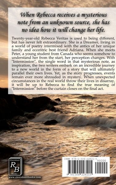 When Rebecca receives a mysterious note from an unknown source, she has no idea how it will change her life. Twenty-year-old Rebecca Veritas is used to being different, but has never felt extraordinary. She is a Dreamer, living in a world of poetry intermixed with the antics of her unique family and eccentric best friend Adriana. When she meets Peter, a young student from Canada who seems somehow to understand her from the start, her perception changes. With "Intermission", the single word in that mysterious note, as inspiration, the two writers embark on an incredible journey to a new world in the form of a story that will ultimately parallel their own lives. Yet, as the story progresses, events remain ever more shrouded in mystery. When unexpected circumstances in the real world throw their lives in disarray, it will be up to Rebecca to find the true meaning of "Intermission" before the curtain closes on the final act.