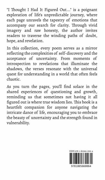 "I Thought I Had It Figured Out..." is a poignant exploration of life's unpredictable journey, where each page unravels the tapestry of emotions that accompany our search for clarity. Through vivid imagery and raw honesty, the author invites readers to traverse the winding paths of doubt, hope, and revelation. In this collection, every poem serves as a mirror reflecting the complexities of self-discovery and the acceptance of uncertainty. From moments of introspection to revelations that illuminate the shadows, the verses resonate with the universal quest for understanding in a world that often feels chaotic. As you turn the pages, you'll find solace in the shared experiences of questioning and growth, reminding us that sometimes not having it all figured out is where true wisdom lies. This book is a heartfelt companion for anyone navigating the intricate dance of life, encouraging you to embrace the beauty of uncertainty and the strength found in vulnerability.