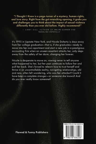 It's 1995 in Upstate New York, and Nicole Doherty is days away from her college graduation when an unseen assailant attacks her, only steps away from the safety of her dorm, changing her forever. Desperate to move on, Nicole vows never to tell anyone what happened to her, but her past continues to follow her and pull her back. She's forced to relearn how to trust herself and thrive in an uncontrollable reality, navigating relationships, old and new, often left wondering, do you ever really know someone?