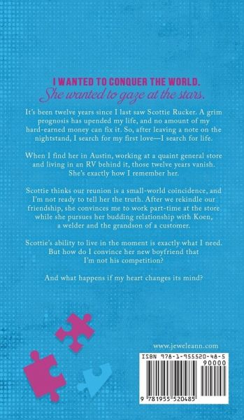 I wanted to conquer the world. She wanted to gaze at the stars. It's been twelve years since I last saw Scottie Rucker. A grim prognosis has upended my life, and no amount of my hard-earned money can fix it. So, after leaving a note on the nightstand, I search for my first love-I search for life. When I find her in Austin, working at a quaint general store and living in an RV behind it, those twelve years vanish. She's exactly how I remember her. Scottie thinks our reunion is a small-world coincidence, and I'm not ready to tell her the truth. After we rekindle our friendship, she convinces me to work part-time at the store while she pursues her budding relationship with Koen, a welder and the grandson of a customer. Scottie's ability to live in the moment is exactly what I need. But how do I convince her new boyfriend that I'm not his competition? And what happens if my heart changes its mind?