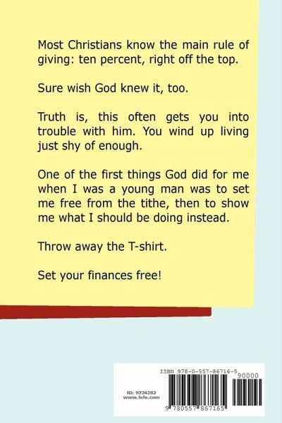 Most Christians know the main rule of giving: ten percent, right off the top. Sure wish God knew it, too. Truth is, this often gets you into trouble with him. You wind up living just shy of enough. As a young man fresh out of tech school, I headed out into the world where all the wonderful truths of life were put to the brutal test of reality. It wasn't "boy meets world," it was, "boy meets God." One soon finds out what God thinks of the life lessons they have been taught. One of the first things the Father ripped away from me was tithing. Then, he showed me what I should be doing instead. And it set my finances free. It set me free. Throw away the T-shirt. Set your finances free!