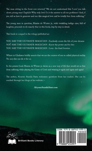 The man sitting in the front row retorted "We do not understand this 'Love' you talk about, young man! Why only love? Is it the answer to all our problem? And, if yes, tell us how to generate and use this magical love and be totally free from suffering? The young man in question, Maxim de Winter Jr., with twinkling indigo eyes, full of laughter, proceeds to do exactly that in this book, step by step in detail. This book is a sequel to the trilogy published as - YOU ARE THE ULTIMATE MAGICIAN: Fearlessly create the life of your dreams YOU ARE THE ULTIMATE MAGICIAN: Know thy power and be free YOU ARE THE ULTIMATE MAGICIAN: Love - the final frontier. Where in Gladiator boldly asserts that we are the creator of our so called physical reality. No one else can do it for us. In the present book Maxim de Winter Jr. shows us a new way of life that would set us free from suffering while playing the Game of Gods and winning it again and again and again! The author, Alcyoné Sumila Starr, welcomes questions from her readers. She can be reached through her blogs at her website: AlcyoneSumilaStarr.com
