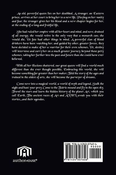 An old, powerful queen lies on her deathbed. A stranger, an Eastern prince, arrives at her court to bring her to a new life. Playing on her vanity and fear, the stranger gives her his blood and a new chapter begins for her, at the ending of a long and fruitful life. She had ruled her empire with all her heart and mind, and now, drained of all energy, she would retire in the only way that a monarch can; she would die. Yet fate had other things in mind. A powerful clan of blood drinkers have been watching her, and guided by other, greater forces, they have decided to make of her a warrior for their own schemes. Yet, destiny will intervene and carry her on a much greater journey, beyond those petty schemes, taking her further into the past and future than she could have ever believed. With all her illusions shattered, our great queen will find a world much different than she ever thought possible. Embracing this world, she will become something far greater than her maker. Told the story of the ages and trained in the oldest of arts, she will become the purveyor of dreams. Come now into a magical world, a world of myth and legend. Stalk the night and hunt your prey. Come to the Fairie mound and fly in the open sky. Travel the stars and learn the hidden history of the planet Art, which you call Earth. The ancient races of Art and ANWN await you with their stories,..and their agendas.