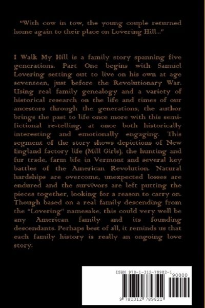 I Walk My Hill is a family story spanning five generations. Part One begins with Samuel Lovering setting out to live on his own at age 17, just before the Revolutionary War. Using real family genealogy and a variety of historical research on the life and times of our ancestors through the generations, the author brings the past to life once more with this semi-fictional re-telling, at once both historically interesting and emotionally engaging. This segment of the story shows depictions of New England factory life (Mill Girls), the hunting and fur trade, farm life in Vermont and several key battles of the American Revolution. Natural hardships are overcome, unexpected losses are endured and the survivors are left putting the pieces together, looking for a reason to carry on. Though based on a real family descending from the "Lovering" namesake, this could very well be any American family and its founding descendants. Perhaps best of all, it reminds us that each family history is really an ongoing love story.