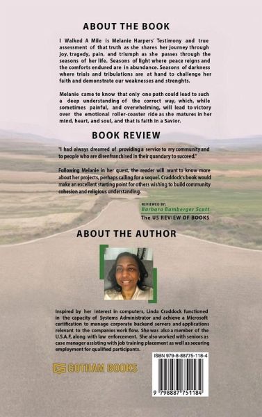 I Walked A Mile is Melanie Harpers' testimony and true assessment of that truth as she shares her journey through joy, tragedy, pain and triumph as she passes through the seasons of her life. Seasons of light where peace reigns and the comforts endured are in abundance. Seasons of darkness where trials and tribulations are at hand to challenge her faith and demonstrate our weaknesses and strengths. Melanie came to know that only one path could lead to such a deep understanding of the correct way, which, while sometimes painful, and overwhelming, will lead to victory over the emotional roller-coaster ride as she matures in her mind, heart, and soul, and that is faith in a Savior.
