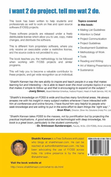 This book has been written to help students and professionals as well to work on free and open source software (F/OSS) projects. These software projects are released under a freely distributable license which allow you to use, copy, make changes, and distribute the software. This is different from proprietary software, where you only receive an executable under a restrictive license, and the source code is not provided to you. The book teaches you the methodology to be followed when working with F/OSS projects and similar programs. This will help you to become a valuable contributor to these projects, and get wide recognition as an individual. Topics covered in this book: Mailing List Guidelines Attention to Detail Project Communication Project Guidelines Development Guidelines Methodology of Work Tools Reading and Writing Art of Making Presentations Sustenance Shakthi Kannan is a Free Software enthusiast who blogs at shakthimaan.com. He can be reached at author@shakthimaan.com. He has been advocating the use of F/OSS across India. His online presence is by the name @shakthimaan.