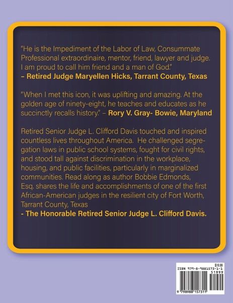 Retired Senior Judge L. Clifford Davis touched and inspired countless lives throughout America. Judge Davis challenged segregation laws in public school systems, fought for civil rights, and stood tall against discrimination in the workplace, housing, and public facilities. His efforts enhanced education and employment opportunities, academic excellence, and economic growth in marginalized communities. Read along as Author Bobbie Edmunds, Esq. shares the life and accomplishments of the first African-American Judge in the resilient city of Fort Worth, Texas, the honorable and retired: Senior Judge L. Clifford Davis. This biography for children covers the birth of L. Clifford Davis, his journey into adulthood, his challenges during the Great Depression, his family values, and the education he acquired throughout his career.