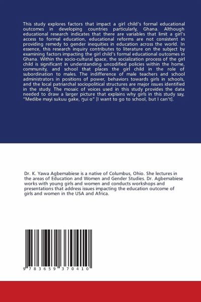 This study explores factors that impact a girl child s formal educational outcomes in developing countries particularly, Ghana. Although educational research indicates that there are variables that limit a girl s access to formal education, educational reforms are not consistent in providing remedy to gender inequities in education across the world. In essence, this research inquiry contributes to literature on the subject by examining factors impacting the girl child s formal educational outcomes in Ghana. Within the socio-cultural space, the socialization process of the girl child is significant in understanding uncodified policies within the home, community, and school that places the girl child in the role of subordination to males. The indifference of male teachers and school administrators in positions of power, behaviors towards girls in schools, and the local patriarchal sociopolitical structures are major issues identified in the study. The mosaic of voices used in this study provides the data needed to draw a larger picture that explains why girls in this study say, Medibe mayi sukuu gake, ui o [I want to go to school, but I can t].