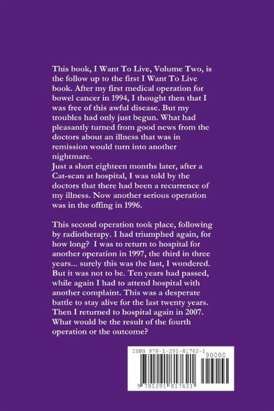 This book, I Want To Live, Volume Two, is the follow up to the first I Want To Live book. After my first medical operation for bowel cancer in 1994, I thought then that I was free of this awful disease. But my troubles had only just begun. What had pleasantly turned from good news from the doctors about an illness that was in remission would turn into another nightmare. Just a short eighteen months later, after a Cat-scan at hospital, I was told by the doctors that there had been a recurrence of my illness. Now another serious operation was in the offing in 1996. This second operation took place, following by radiotherapy. I had triumphed again, for how long? I was to return to hospital for another operation in 1997, the third in three years... surely this was the last, I wondered. But it was not to be. Ten years passed, then I returned to hospital again in 2007.