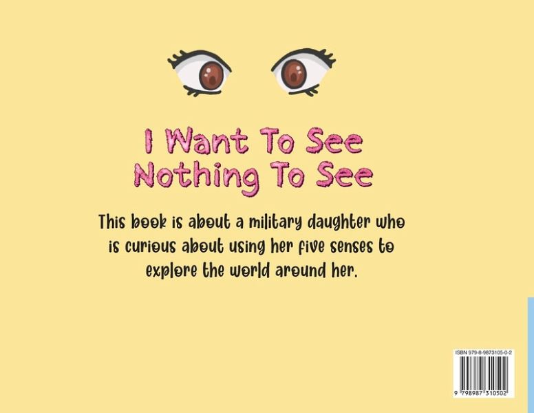 I want to see nothing to see tells a charming short story about a little girl born to a military family that uses her five senses (see, touch, feel, hear and smell) to explore and discover the world around her.