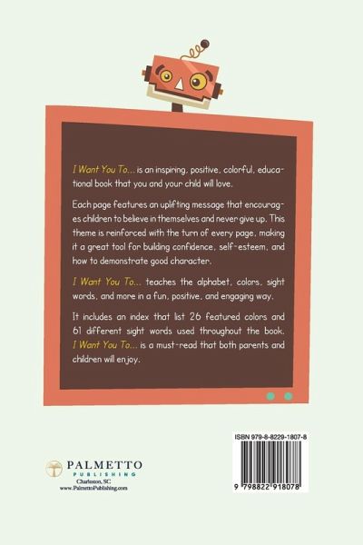I Want You To... is an inspiring, positive, colorful, educational book that you and your child will love. Each page features an uplifting message that encourages children to believe in themselves and never give up. This theme is reinforced with the turn of every page, making it a great tool for building confidence, self-esteem, and how to demonstrate good character. I Want You To... teaches the alphabet, colors, sight words, and more in a fun, positive, and engaging way. It includes an index that list 26 featured colors and 61 different sight words used throughout the book. I Want You To... is a must-read that both parents and children will enjoy.