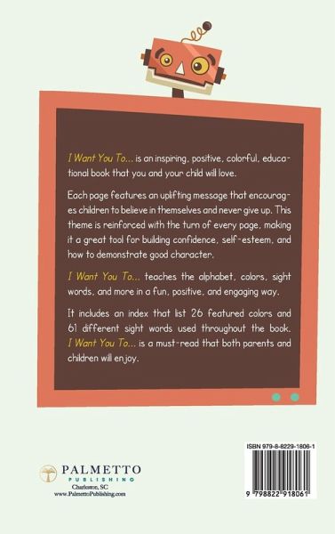 I Want You To... is an inspiring, positive, colorful, educational book that you and your child will love. Each page features an uplifting message that encourages children to believe in themselves and never give up. This theme is reinforced with the turn of every page, making it a great tool for building confidence, self-esteem, and how to demonstrate good character. I Want You To... teaches the alphabet, colors, sight words, and more in a fun, positive, and engaging way. It includes an index that list 26 featured colors and 61 different sight words used throughout the book. I Want You To... is a must-read that both parents and children will enjoy.