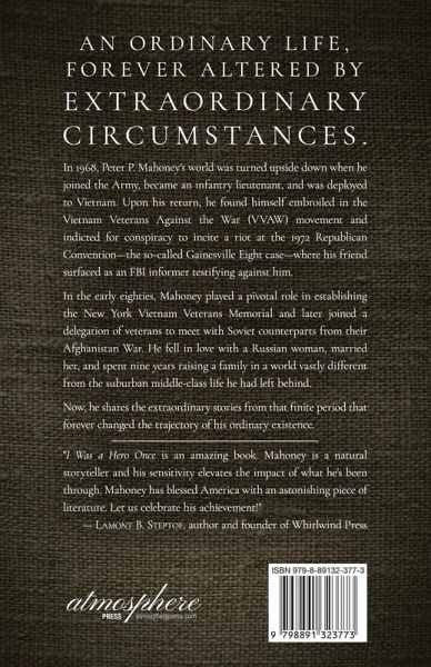 An ordinary life, forever altered by extraordinary circumstances. In 1968, Peter P. Mahoney's world was turned upside down when he joined the Army, became an infantry lieutenant, and was deployed to Vietnam. Upon his return, he found himself embroiled in the Vietnam Veterans Against the War (VVAW) movement and indicted for conspiracy to incite a riot at the 1972 Republican Convention-the so-called Gainesville Eight case-where his friend surfaced as an FBI informer testifying against him. In the early eighties, Mahoney played a pivotal role in establishing the New York Vietnam Veterans Memorial and later joined a delegation of veterans to meet with Soviet counterparts from their Afghanistan War. He fell in love with a Russian woman, married her, and spent nine years raising a family in a world vastly different from the suburban middle-class life he had left behind. Now, he shares the extraordinary stories from that finite period that forever changed the trajectory of his ordinary existence. "I Was a Hero Once is an amazing book. Mahoney is a natural storyteller and his sensitivity elevates the impact of what he's been through. Mahoney has blessed America with an astonishing piece of literature. Let us celebrate his achievement!" - Lamont B. Steptoe, author and founder of Whirlwind Press