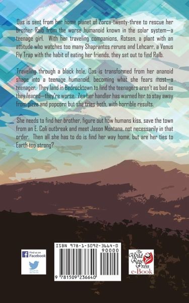 Oas is sent from her home planet of Zorca-twenty-three to rescue her brother Ralb from the worse humanoid known in the solar system--a teenage girl. With her traveling companions, Rotsen, a plant with an attitude who watches too many Shaprantos reruns and Lehcarr, a Venus Fly Trap with the habit of eating her friends, they set out to find Ralb. Travelling through a black hole, Oas is transformed from her ananoid shape into a teenage humanoid, becoming what she fears most--a teenager. They land in Bedrocktown to find the teenagers aren't as bad as they feared--they're worse. Zen her handler has warned her to stay away from pizza and popcorn but she tries both, with horrible results. She needs to find her brother, figure out how humans kiss, save the town from an E. Coli outbreak and meet Jason Montana, not necessarily in that order. Then all she has to do is find her way home, but are her ties to Earth too strong?