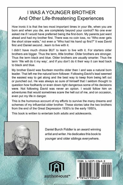 I Was A Younger Brother and other life-threatening experiences A Memoir by Daniel llurch Fiddler How ironic it is that the two most important times in your life, when you are born and when you die, are completely beyond your control? No one ever asked me if I would have preferred being the first-born- My parents just went ahead and had my brother first. There was no coin toss, no "Who ever gets the short straw waits," not even a "Who had his hand up first?" It was David first and Daniel sevond...learn to live with it. I didn't have much choice BUT to learn to live with it. For starters older brothers are bigger. Thus the term, little brother. Older brothers are stronger. Thus the thr black and blue. Older brothers are usually smarter. Thus the te 'We will do it my way', and if you don't do it their way it can lead back to black and blue. My brother David was fourteen months older then. I and was a natural bouj leader, That left me the natural born follower. Following David's lead seemed the easiest way to get along and the best way to keep from being left out or punched out. He was always so sure of himself that I seldom thought to question how foolh&dy or even down right dangerous some of his decisions were. Not following David was never an option. I would follow him on adventures that would sometimes scare the hell out of mc, and on occasion, even put my life in danger. This is the humorous account of my efforts to survive the many dreams and schemes of my influential older brother. These stories take the two brothers from the end of the Great Depression 1930's to the early 1950's, This book is dedicated to younger and older siblings everywhere and is written to entertain both adults and adolescents.