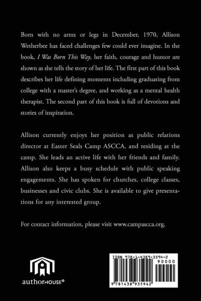 Born with no arms or legs in December, 1970, Allison Wetherbee has faced challenges few could ever imagine. In the book, I Was Born This Way, her faith, courage and humor are shown as she tells the story of her life. The first part of this book describes her life defining moments including graduating from college with a master's degree, and working as a mental health therapist. The second part of this book is full of devotions and stories of inspiration.