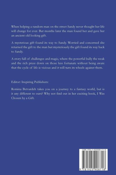 When helping a random man on the street Sandy never thought her life will change for ever. But months later the man found her and gave her an ancient old looking gift. An un-normal gift found its way to Sandy. Worried and concerned she returned the gift to the man but mysteriously the gift found its way back to Sandy. A story full of challenges and magic, where the powerful bully the weak and the rich press down on those less fortunate without being aware that the cycle of life is vicious and it will turn its wheels against them. Editor: Inspiring Publishers: Romina Betvardeh takes you on a journey to a fantasy world, but is it any different to ours? Why not find out in her exciting book, I Was Chosen by a Gift.