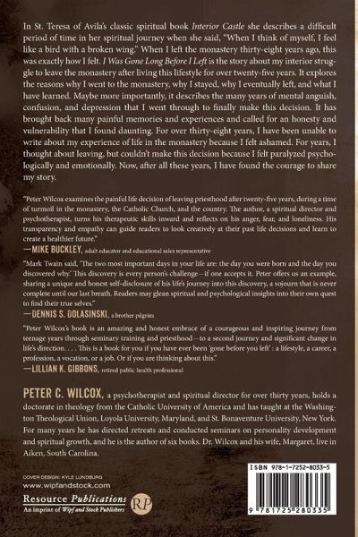 In St. Teresa of Avila's classic spiritual book Interior Castle she describes a difficult period of time in her spiritual journey when she said, ""When I think of myself, I feel like a bird with a broken wing."" When I left the monastery thirty-eight years ago, this was exactly how I felt. I Was Gone Long Before I Left is the story about my interior struggle to leave the monastery after living this lifestyle for over twenty-five years. It explores the reasons why I went to the monastery, why I stayed, why I eventually left, and what I have learned. Maybe more importantly, it describes the many years of mental anguish, confusion, and depression that I went through to finally make this decision. It has brought back many painful memories and experiences and called for an honesty and vulnerability that I found daunting. For over thirty-eight years, I have been unable to write about my experience of life in the monastery because I felt ashamed. For years, I thought about leaving, but couldn't make this decision because I felt paralyzed psychologically and emotionally. Now, after all these years, I have found the courage to share my story.