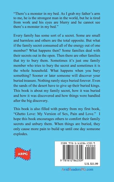 "There's a monster in my bed. As I grab my father's arm to me, he is the strongest man in the world, but he is tired from work and his eyes are blurry and he cannot see there's a monster in my bed." Every family has some sort of a secret. Some are small and harmless and others are the total opposite. But what if the family secret consumed all of the energy out of one member? What happens then? Some families deal with their secrets out in the open. Then there are other families that try to bury them. Sometimes it's just one family member who tries to bury the secret and sometimes it is the whole household. What happens when you bury something? Sooner or later someone will discover your buried treasure. Nothing rarely stays buried forever. Even the sands of the desert have to give up their buried kings. This book is about my family secret, how it was buried and how it was discovered and how things were handled after the big discovery. This book is also filled with poetry from my first book, "Ghetto Love: My Version of Sex, Pain and Love." I hope this book encourages others to comfort their family secrets and unbury them. When things are buried, they only cause more pain to build up until one day someone explodes.