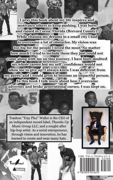 I pray this book about my life inspires and motivates others to keep pushing. I was born and raised in Cocoa, Florida (Brevard County). While chasing my dreams in a small city I had to overcome a lot of obstacles. My vision was too big for the people I loved the most. No matter how much I tried to include them they just could not come along with me on this journey. I have been doubted my whole career but my self - confidence would not allow me to give up. I always knew I was different from my peers, and I would grow to become an impactful person. In this book I talk more about how I overcame adversity and broke generational curses. I was slept on. Trashon "Tray Plus" Waller is the CEO of an independent record label, Thumbs Up Music Group LLC, and a sought-after hip-hop artist. As a serial entrepreneur, through vision and innovation, he has learned to create and wear many hats.