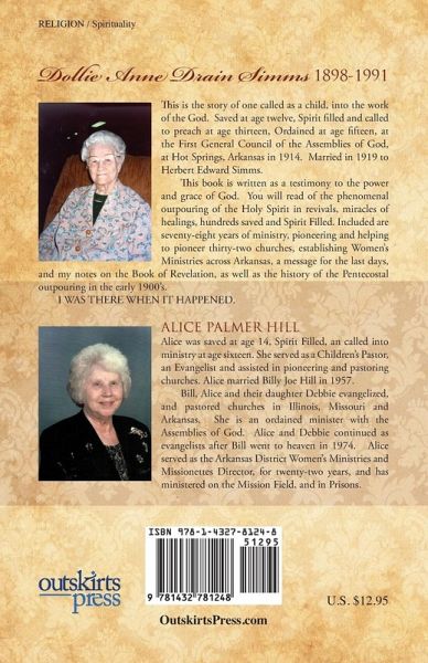 Dollie Anne Drain Simms 1898-1991... This is the story of one called as a child, into the work of the God. Saved at age twelve, Spirit filled and called to preach at age thirteen, Ordained at age fifteen, at the First General Council of the Assemblies of God, at Hot Springs, Arkansas in 1914. Married in 1919 to Herbert Edward Simms. This book is written as a testimony to the power and grace of God. You will read of the phenomenal outpouring of the Holy Spirit in revivals, miracles of healings, hundreds saved and Spirit Filled. Included are seventy-eight years of ministry, pioneering and helping to pioneer thirty-two churches, establishing Women's Ministries across Arkansas, a message for the last days, and my notes on the Book of Revelation, as well as the history of the Pentecostal outpouring in the early 1900's. I WAS THERE WHEN IT HAPPENED.