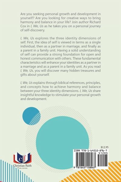Are you seeking personal growth and development in yourself? Are you looking for creative ways to bring harmony and balance in your life? Join author Richard Cox in I, We, Us as he takes you on a personal journey of self-discovery. I, We, Us explores the three identity dimensions of self. First, the idea of self is viewed in terms as a single individual, then as a partner in marriage, and finally as a parent in a family unit. Having a solid understanding of self can provide a strong foundation for open and honest communication with others. These fundamental characteristics will enhance your identities as a partner in a marriage and as a parent in a family unit. As you read I, We, Us, you will discover many hidden treasures and gifts about yourself. I, We, Us explains through biblical references, principles, and concepts how to achieve harmony and balance between your three identity dimensions. I, We, Us share insightful knowledge to stimulate your personal growth and development.