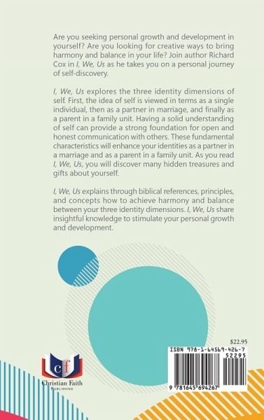 Are you seeking personal growth and development in yourself? Are you looking for creative ways to bring harmony and balance in your life? Join author Richard Cox in I, We, Us as he takes you on a personal journey of self-discovery. I, We, Us explores the three identity dimensions of self. First, the idea of self is viewed in terms as a single individual, then as a partner in marriage, and finally as a parent in a family unit. Having a solid understanding of self can provide a strong foundation for open and honest communication with others. These fundamental characteristics will enhance your identities as a partner in a marriage and as a parent in a family unit. As you read I, We, Us, you will discover many hidden treasures and gifts about yourself. I, We, Us explains through biblical references, principles, and concepts how to achieve harmony and balance between your three identity dimensions. I, We, Us share insightful knowledge to stimulate your personal growth and development.