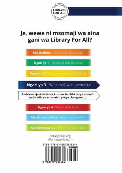 Old man Moses hunted for food for his family. One day his traps caught a giraffe and he tries to throw his spear at it. The giraffe escapes and Moses returns home empty-handed. Mzee Musa aliwinda chakula cha familia yake. Siku moja mitego yake ilimnasa twiga na anajaribu kumrushia mkuki wake. Twiga anatoroka na Musa anarudi nyumbani mikono mitupu. Your purchase of this book supports Library For All in its mission to make knowledge available to all, equally.