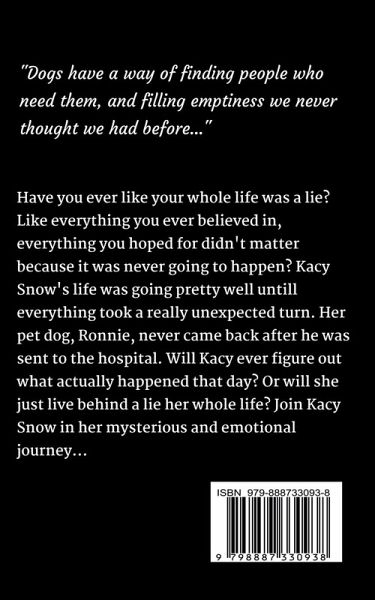 ""I Will Never 'Fur-get' You"" is a non-fiction novel based on a girl named Kacy Snow and her pet dog, Ronnie. After being set to the hospital, he never returned. Will Kacy ever figure out what actually happened that day? Or will she just live behind a lie her whole life? Join Kacy Snow in her mysterious yet emotional journey... This story is about how a girl learns the reality of owning a pet and coping with the emptiness it leaves after it's gone. This whole novel is bassed on the real life experience of the author. It revolves around the idea of what most pet owners go through.