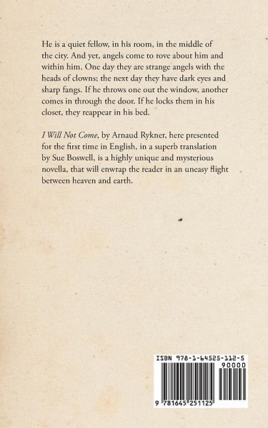 He is a quiet fellow, in his room, in the middle of the city. And yet, angels come to rove about him and within him. One day they are strange angels with the heads of clowns; the next day they have dark eyes and sharp fangs. If he throws one out the window, another comes in through the door. If he locks them in his closet, they reappear in his bed. I Will Not Come, by Arnaud Rykner, here presented for the first time in English, in a superb translation by Sue Boswell, is a highly unique and mysterious novella, that will enwrap the reader in an uneasy flight between heaven and earth.