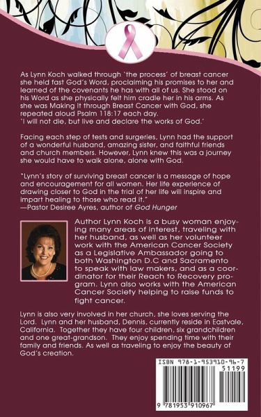 "As Lynn Koch walked through 'the process' of breast cancer she held fast God's Word, proclaiming his promises to her and learned of the covenants he has with all of us. She stood on his Word as she physically felt him cradle her in his arms. As she was Making It through Breast Cancer with God, she repeated aloud Psalm 118:17 each day. 'I will not die, but live and declare the works of God.' "Facing each step of tests and surgeries, Lynn had the support of a wonderful husband, amazing sister, and faithful friends and church members. However, Lynn knew this was a journey she would have to walk alone, alone with God. "Lyn's story of surviving breast cancer is a message of hope and encouragement for all women. Her life experience of drawing closer to God in the trial of her life will inspire and impart healing to those who read it." -Pastor Desiree Ayres, author of God Hunger