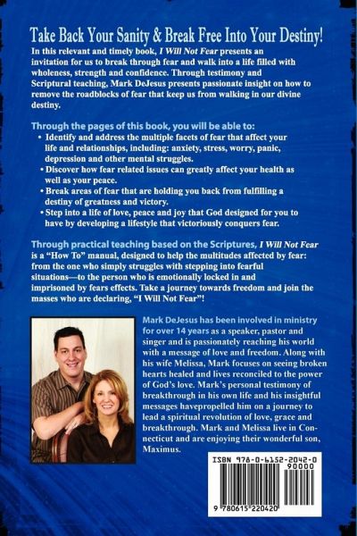 I Will Not Fear is an invitation for us to break through fear and walk into a life filled with wholeness, strength, and confidence. Through testimony and Scriptural teaching, Mark DeJesus presents insight on how to remove the roadblocks of fear that keep us from our divine destiny. Through this book, you will be able to: Identify the facets of fear that affect your life and relationships, including: anxiety, stress, worry, panic, depression and other mental struggles. Discover how fear related issues can greatly affect your health as well as your peace. Step into a life of love, peace and joy that God wants you to have by developing a lifestyle that victoriously conquers fear. This is a "How To" manual, designed to help the multitudes affected by fear: from the one who simply struggles with stepping into fearful situations-to the one who is emotionally locked in and imprisoned by fears effects. Take a journey towards freedom and join the masses who are declaring, "I Will Not Fear"!