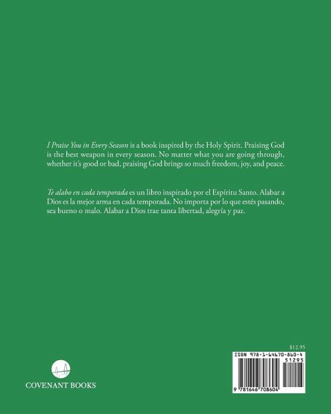 I Praise You in Every Season is a book inspired by the Holy Spirit. Praising God is the best weapon in every season. No matter what you are going through, whether it's good or bad, praising God brings so much freedom, joy, and peace. Te alabo en cada temporada es un libro inspirado por el Espíritu Santo. Alabar a Dios es la mejor arma en cada temporada. No importa por lo que estés pasando, sea bueno o malo. Alabar a Dios trae tanta libertad, alegría y paz.