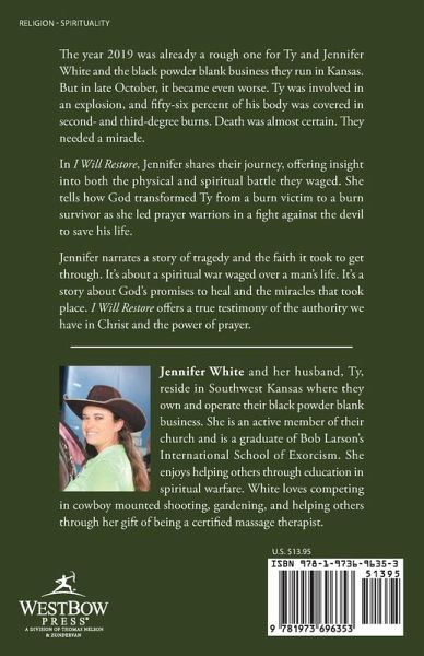 The year 2019 was already a rough one for Ty and Jennifer White and the black powder blank business they run in Kansas. But in late October, it became even worse. Ty was involved in an explosion, and fifty-six percent of his body was covered in second- and third-degree burns. Death was almost certain. They needed a miracle. In I Will Restore, Jennifer shares their journey, offering insight into both the physical and spiritual battle they waged. She tells how God transformed Ty from a burn victim to a burn survivor as she led prayer warriors in a fight against the devil to save his life. Jennifer narrates a story of tragedy and the faith it took to get through. It's about a spiritual war waged over a man's life. It's a story about God's promises to heal and the miracles that took place. I Will Restore offers a true testimony of the authority we have in Christ and the power of prayer.
