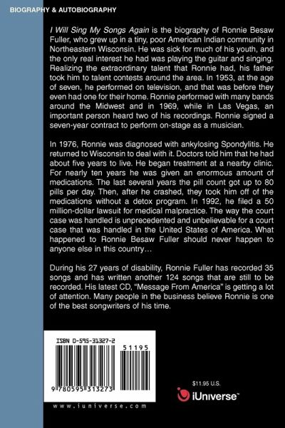 I'll Sing My Songs Again is the biography of Ronnie Besaw Fuller, who grew up in a tiny, poor American Indian community in Northeastern Wisconsin. He was sick for much of his youth, and the only real interest he had was playing the guitar and singing. Realizing the extraordinary talent that Ronnie had, his father took him to talent contests around the area. In 1953, at the age of seven, he performed on television, and that was before they even had one for their home. Ronnie performed with many bands around the midwest and in 1969, while in Las Vegas, an important person heard two of his recordings. Ronnie signed a seven-year contract to perform on-stage as a musician. In 1976, Ronnie was diagnosed with Ankylasing Spondylitis. He returned to Wisconsin to deal with it. Doctors told him that he had about five years to live. He began treatment at a nearby clinic. For nearly ten years he was given an enormous amount of medications. The last several years the pill count got up to 80 pills per day. Then, after he crashed, they took him off of the medications without a detox program. In 1992, he filed a 50 million-dollar lawsuit for medical malpractice. The way the court case was handled is unprecedented and unbelievable for a court case that was handled in the United States of America. What happened to Ronnie Besaw Fuller should never happen to anyone else in this country...