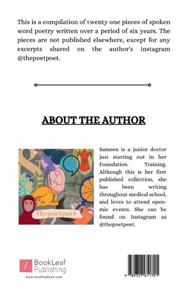 Sameen is a 24 year old doctor just starting out in her Foundation Training. She has been writing throughout medical school, and with just a few open-mic and live performances behind her, this is her first book compiled of poetry written over a six year period. She can be found on Instagram as @thepoetpoet.