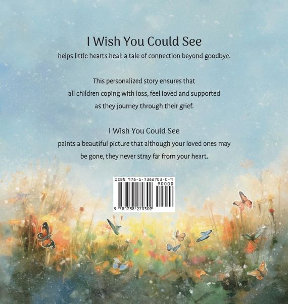 I Wish You Could See helps little hearts heal; a tale of connection beyond goodbye. This compassionate children's book navigates loss with love and understanding. This customizable approach to dealing with loss ensures that your little one feels loved and supported as they journey through their grief. This book is inclusive to all races and genders and can be a heartfelt resource to all children who have experienced the loss of a loved one. I Wish You Could See paints a beautiful picture that although your loved ones may be gone, they never stray far from your heart.