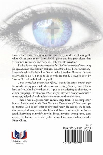 I was a lone sinner, dying of cancer, and carrying the burden of guilt when Christ came to me. It was by His grace, and His grace alone, that He showed me mercy, and because I believed, He saved me. Really, I am a very ordinary person, but God did an extraordinary thing for my salvation. This was my problem: I wanted to be a "better Christian." I wanted unshakable faith, like Daniel in the lion's den. However, I wasn't really able to do it. I tried to do it with my mind. I tried to do it by "works." I tried to do it with my will. I was tripped up by my own efforts. I sat in the same church pew for nearly twenty years, said the same words every Sunday, and tried as hard as I could to believe them all. I gave to the offering, to charities, to capital campaigns, went to "work Saturdays," attended finance committee meetings, helped after church services to count the collections. Then, I was diagnosed with cancer, stage four. To be completely honest, I was scared inside. "No! Not now! I'm not ready!" But I was ripe for testing. God doesn't wait until we feel ready. He sees all, we do not. God uses all things, even calamities and floods and wars for ultimate good. Everything in my life, my childhood, my sins, wrong turns, even cancer, has led me to be exactly the person I am now: a witness to the Risen Christ.