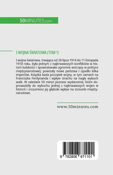 I wojna ¿wiatowa, trwaj¿ca od 28 lipca 1914 do 11 listopada 1918 roku, by¿a jednym z najkrwawszych konfliktów w historii ludzko¿ci i spowodowäa ogromne wstrz¿sy w polityce mi¿dzynarodowej: powstäy nowe pästwa i upad¿o kilka imperiów. Ksi¿¿ka bada pocz¿tek wojny, w tym zamach na Franciszka Ferdynanda i wp¿yw strachu na nag¿y wybuch walk. W zaledwie 50 minut poznasz wydarzenia, które doprowadzi¿y do wybuchu jednej z najkrwawszych wojen w historii i zrozumiesz jej g¿¿boki wp¿yw na stosunki mi¿dzynarodowe. Ta prosta i pouczaj¿ca ksi¿¿ka oferuje dok¿adne omówienie kluczowych momentów, które doprowadzi¿y do wybuchu wojny, w tym konfrontacji na Bäkanach i tworzenia si¿ sojuszy mi¿dzy mocarstwami centralnymi a Potrójn¿ Entent¿. Zawiera tak¿e pe¿ny opis pierwszych bitew, cenne wprowadzenie do genezy konfliktu oraz ocen¿ impasu, daj¿c Ci wszystkie niezb¿dne informacje na temat fazy otwarcia I wojny ¿wiatowej.