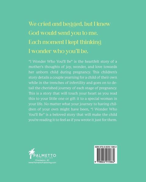 We cried and begged, but I knew God would send you to me. Each moment I kept thinking I wonder who you'll be. "I Wonder Who You'll Be" is the heartfelt story of a mother's thoughts of joy, wonder, and love towards her unborn child during pregnancy. This children's story details a couple yearning for a child of their own while in the trenches of infertility and goes on to detail the cherished journey of each stage of pregnancy. This is a story that will touch your heart as you read this to your little one or gift it to a special woman in your life. No matter what your journey to having children of your own might have been, "I Wonder Who You'll Be" is a beloved story that will make the child you're reading it to feel as if you wrote it just for them.