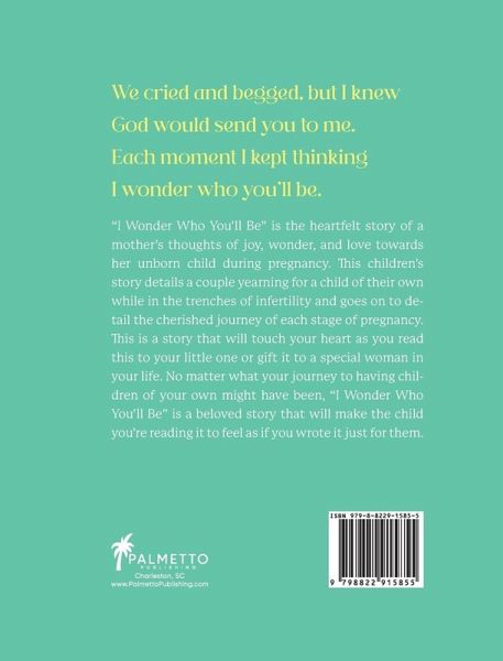 We cried and begged, but I knew God would send you to me. Each moment I kept thinking I wonder who you'll be. "I Wonder Who You'll Be" is the heartfelt story of a mother's thoughts of joy, wonder, and love towards her unborn child during pregnancy. This children's story details a couple yearning for a child of their own while in the trenches of infertility and goes on to detail the cherished journey of each stage of pregnancy. This is a story that will touch your heart as you read this to your little one or gift it to a special woman in your life. No matter what your journey to having children of your own might have been, "I Wonder Who You'll Be" is a beloved story that will make the child you're reading it to feel as if you wrote it just for them.