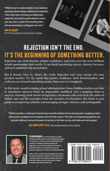 Rejection isn't the end. It's the beginning of something better. Rejection can crush dreams, shatter confidence, and leave even the most brilliant minds questioning their worth. It can derail promising careers, destroy fortunes, and turn ambition into uncertainty. But it doesn't have to. Here's the truth: Rejection isn't your enemy-it's your greatest teacher. It's the spark that ignites resilience, fuels determination, and redirects you toward something greater than you ever imagined. In this book, award-winning school administrator Glenn Robbins teaches you how to transform rejection from an impassable roadblock into a stepping stone to success. Drawing from stories of legendary musicians who rose from the ashes of failure and real-life examples from the trenches of education, this book is your guide to conquering setbacks and emerging stronger, smarter, and unstoppable.