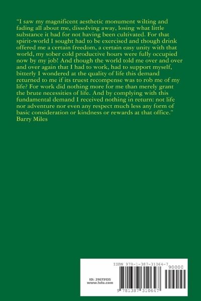 "I saw my magnificent aesthetic monument wilting and fading all about me, dissolving away, losing what little substance it had for not having been cultivated. For that spirit-world I sought had to be exercised and though drink offered me a certain freedom, a certain easy unity with that world, my sober cold productive hours were fully occupied now by my job! And though the world told me over and over and over again that I had to work, had to support myself, bitterly I wondered at the quality of life this demand returned to me if its truest recompense was to rob me of my life? For work did nothing more for me than merely grant the brute necessities of life. And by complying with this fundamental demand I received nothing in return: not life nor adventure nor even any respect much less any form of basic consideration or kindness or rewards at that office." Barry Miles