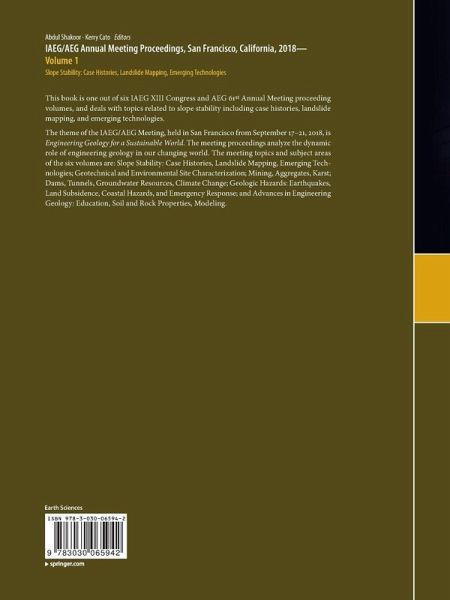 The theme of the IAEG/AEG Meeting, held in San Francisco from September 17-21, 2018, is Engineering Geology for a Sustainable World. The meeting proceedings analyze the dynamic role of engineering geology in our changing world. The meeting topics and subject areas of the six volumes are: Slope Stability: Case Histories, Landslide Mapping, Emerging Technologies; Geotechnical and Environmental Site Characterization; Mining, Aggregates, Karst; Dams, Tunnels, Groundwater Resources, Climate Change; Geologic Hazards: Earthquakes, Land Subsidence, Coastal Hazards, and Emergency Response; and Advances in Engineering Geology: Education, Soil and Rock Properties, Modeling.