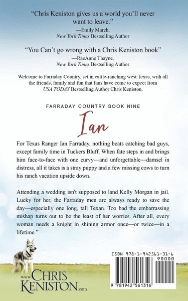 Tuckers bluff isn't done playing matchmaker for the Farradays. Welcome to Ian, book 9 in the Farraday Country series set in cattle-ranching west Texas, with all the friends, family and fun that fans have come to expect from USA TODAY Bestselling author Chris Keniston. For Texas Ranger Ian Farraday, nothing beats catching bad guys, except family time in Tuckers Bluff. When fate steps in and brings him face-to-face with one curvy-and unforgettable-damsel in distress, all it takes is a stray puppy and a few missing cows to turn his ranch vacation upside down. Attending a wedding isn't supposed to land Kelly Morgan in jail. Lucky for her, the Farraday men are always ready to save the day-especially one long, tall Texan. Too bad the embarrassing mishap turns out to be the least of her worries. After all, every woman needs a knight in shining armor once-or twice-in a lifetime. Praise for the Farraday Series: "Loved it. Fast moving and fun." Jodi Thomas, New York Times Bestselling Author on DECLAN "My kind of read! Spend an afternoon with a great romance story, a feisty heroine, and one unforgettable hero." Lindsay McKenna, New York Times Bestselling Author on ADAM "Chris Keniston gives us a world you'll never want to leave." Emily March, New York Times Bestselling Author of Eternity Springs series on FARRADAY COUNTRY SERIES "Spellbinding!" Lori Wilde, New York Times Bestselling Author on ETHAN More Books in the Farraday Country Series: Adam - Book 1 Brooks - Book 2 Connor - Book 3 Declan - Book 4 Ethan - Book 5 Finn - Book 6 Grace - Book 7 Hannah - Book 8 Ian - Book 9 Jamison Book 10 - Keeping Eileen Book 11 For more on Chris and her other series check out her website Or follow her on facebook Chris Keniston Author