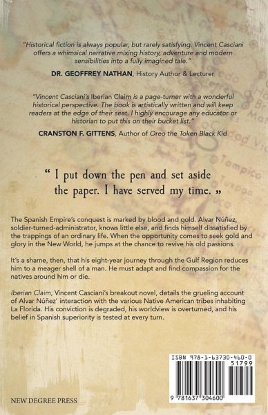 The Spanish Empire's conquest is marked by blood and gold. Alvar Núñez, soldier-turned-administrator, knows little else, and finds himself dissatisfied by the trappings of an ordinary life. When the opportunity comes to seek gold and glory in the New World, he jumps at the chance to revive his old passions. It's a shame, then, that his eight-year journey through the Gulf Region reduces him to a shell of his former self. To survive, he must adapt and find compassion for the people around him. Iberian Claim, Vincent Casciani's debut novel, details Alvar Núñez' grueling and aimless journey across North America. His conviction is degraded, his worldview is challenged, and his desire for glory is tested at every turn.