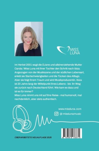 Im Herbst 2001 wagt die DJane und alleinerziehende Mutter Carola / Miss Luna mit ihrer Tochter den Schritt nach Ibiza. Angezogen von der Musikszene und der südlichen Lebensart, erlebt sie Startschwierigkeiten und die Tücken des Alltags. Aber sie folgt ihrem Traum und wird Musikproduzentin. Ibiza ist 20 Jahre lang der Mittelpunkt ihres Lebens - bis ihr Weg sie zurück nach Deutschland führt. Wie kam es dazu und ist es für immer?Miss Luna nimmt uns mit auf ihre Reise - mal humorvoll, mal nachdenklich, aber stets authentisch.